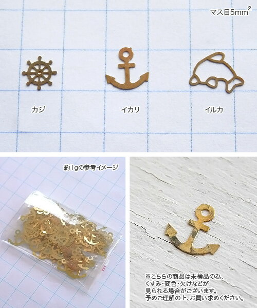 サイズ ・カジ: 直径約4×厚さ約0.2(mm) ・イカリ: 縦約5×横約5×厚さ約0.2(mm) ・イルカ:縦約6×横約5×厚さ約0.2(mm) カラー ゴールド 種類 カジイカリイルカ 個数 約1g 発送についてこちらは訳あり商品です。