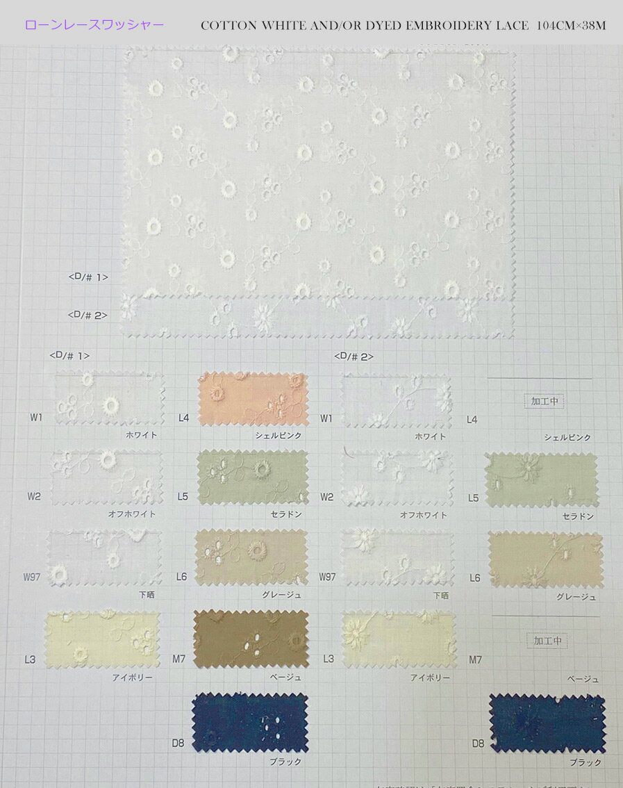 追加で抗ウイルス加工のご希望は⇒こちらです 104cm巾(有効巾96/98cm)×38m(1反) 品名 : ローンレース ワッシャー 混率 : 綿(コットン) 100% 生地タイプ : ワッシャー/レース/刺繍 用途 : トップス/ワンピース/スカート/ドレス(衣裳)/バッグ・カバン/ファッション雑貨/衣料その他/カーテン・のれん/インテリア雑貨/生活雑貨その他 柄 : 植物(花・草・ツタ)柄 丹後の実店舗でも同時販売をしている反物です。