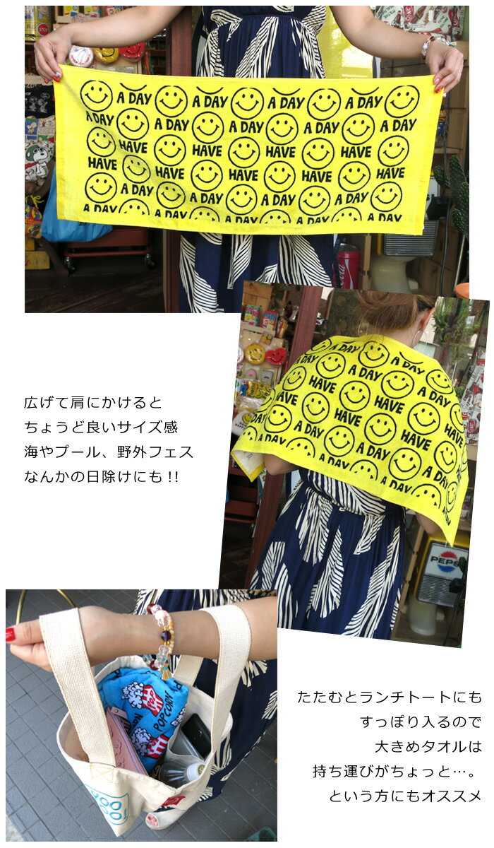 フェイスタオル かわいい オシャレ ビーチタオル プールタオル バスタオル にこちゃん スマイル ハンバーガー ポテト ポップコーン 国旗 ジャンクフード おもしろ雑貨 フェス ダブルスリー インスタ映え アメリカン雑貨 運動会 体育祭 【メール便OK】