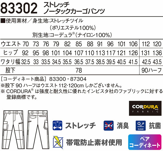 スペック メーカー 自重堂(JICHODO) 品番/シリーズ 83302/83300シリーズ シーズン 秋冬物 ※このシリーズの春夏対応シリーズはコチラ 商品名 ストレッチノータックカーゴパンツ 素材 ストレッチツイル(ポリエステル100%) 別生地:コーデュラR(ナイロン100%) 機能 コーデュラR、ストレッチ、消臭、抗菌、帯電防止素材使用 仕様 CORDURA は強度と耐久性に優れたインビスタ社のファブリックに対する登録商標です。